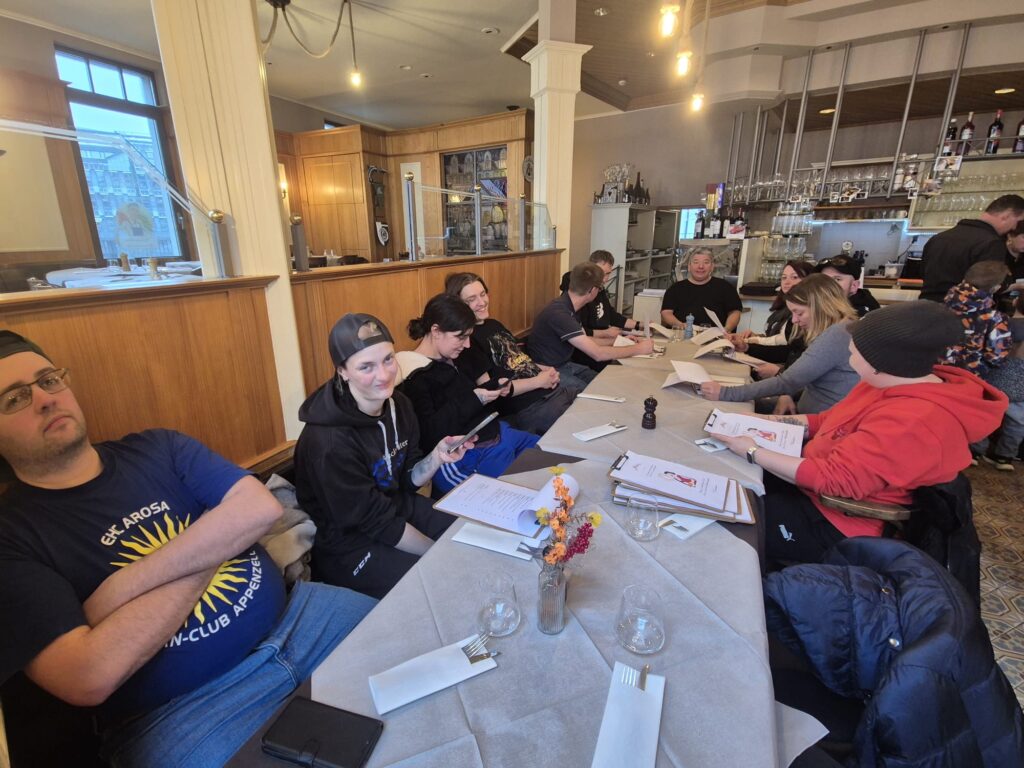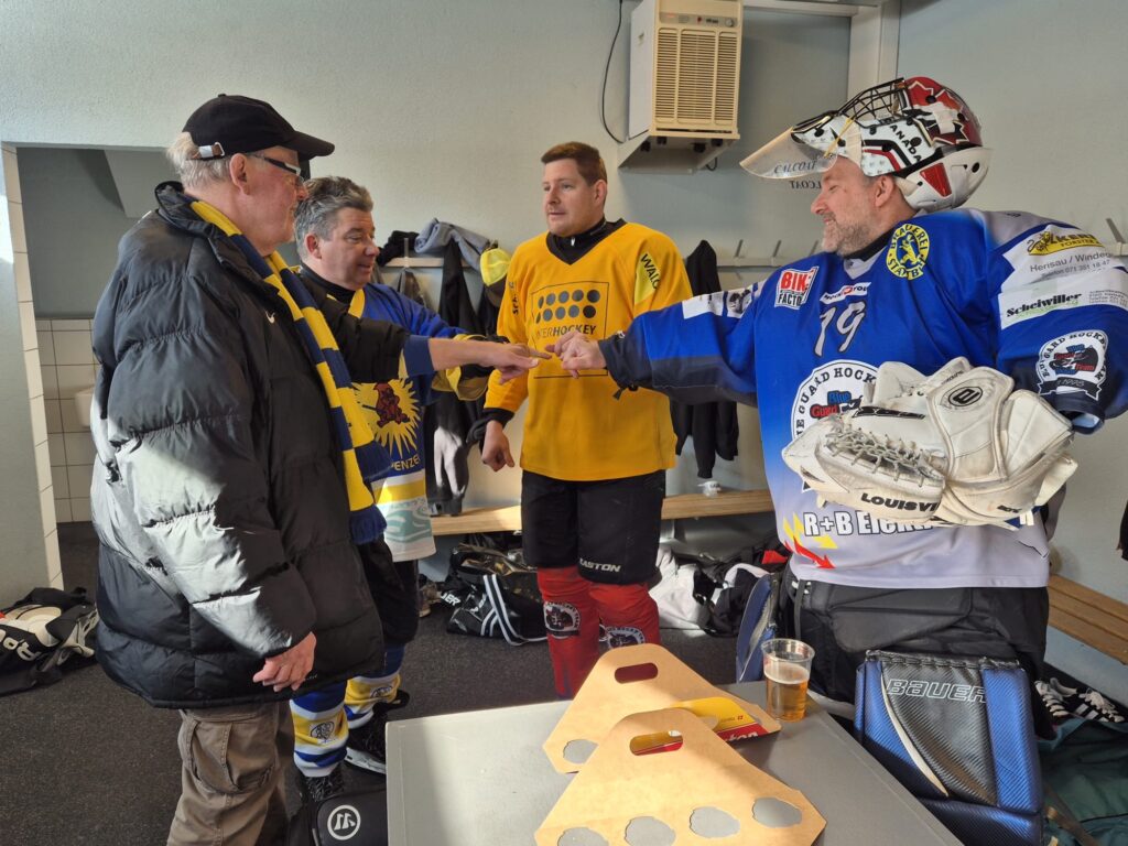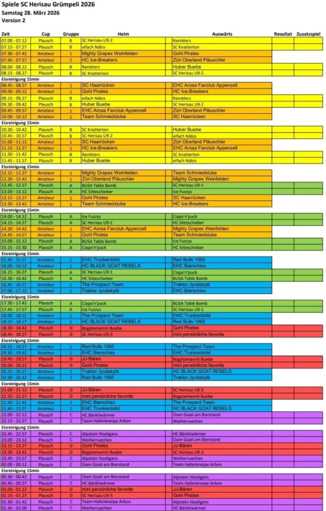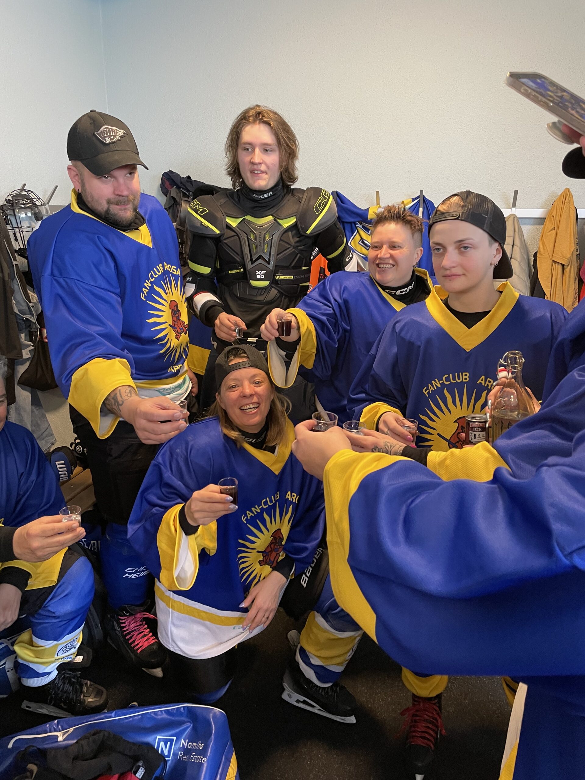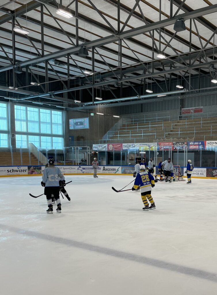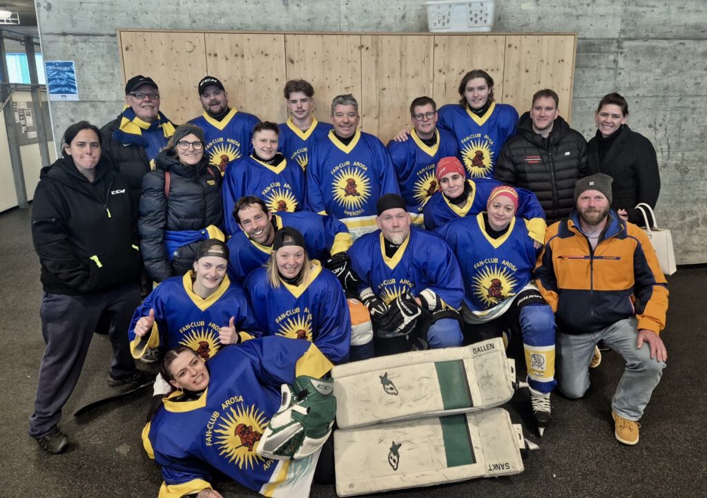 Am 28./29.März beehrt unser Hockeyteam das Plauschturnier in Herisau. Auf dem Spielplan seht ihr unsere Spiele und wenn ihr uns besuchen und anfeuern wollt seid ihr alle herzlich willkommenDa die Fanclub-SM aus undurchsichtigen Gründen abgesagt wurde schauten wir uns nach einer Alternative um und fanden das Plauschturnier in Herisau absolut passendWie man auf dem Spielplan sieht ging es bereits am Samstagmorgen los und so trafen sich die einen schon am Freitagabend und konzentrierten sich mit passender Unterstützung auf die SpielvorbereitungNoch ist die Garderobe etwas leer, doch bald gehts losAuch unser Staff Pädi1, Pädi2 und Pädi3 sind bereitDas erste Spiel gegen den SC Haarrücken oder so steht anAuch gegen die Züri Oberland Pläuschler wehrten wir uns mit allen KräftenZwar gingen beide Spiele knapp verloren, doch es machte allen grossen Spass, wiedermal auf dem Eis herum zu fahrenNun warteten noch die Ice Breakers auf uns, zu Beginn hielten wir gut mit und kassierten erst gegen Schluss die entscheidenden ToreDann gabs eine längere Pause und wie gewohnt wartete Berni’s Röteli auf unsAuch der Schnupf kam zum Zuge: Arosa, Litzirüti, Langwiiis…priiis und hopp ArosaHoppla, da wurde doch das Trikot verwechselt…aber sie macht sich gut damitAuch der Vorstand und der Ex-Presi hatten noch einige wichtige Dinge zu besprechenZum letzten Spiel warteten unsere langjährigen Freunde aus Weinfelden, die Mighty GrapesAuch hier gab unsere Abwehr allesund Goalie Käthiverhinderte manches Tor der Weinfelder, trotzdem verloren wir auch das letzte SpielUnser Goalie powerte mit Säntis EnergieNun ist das Turnier für uns vorbei, Zeit zum Ausruhen und die Geselligkeit pflegenUnsere Verteidigung ist immer noch voll im SchussHaaaalt, jetzt gibt es noch das MannschaftsphotoUnser Team, oben vl: Babs, Säntis, Berni, Mario, Tämi, Daniel, Casa, Markus, Severin, Pädi, Mama, untenvl: Denise, Frischi, Säxu, Flip, Brigitte, Tamara, Päde, vorne Goalie KäthiPuuuh, endlich ist die Eiszeit vorbei und das Vergnügen wartetIn der Herisauer Pizzeria ist alles bereit für einen ergiebigen und fein schmeckenden ZnachtBald gehts ins Bett und ein lässiger Anlass ist vorbei. Ein ganz grosses Dankeschön allen fürs Eis zerkratzen, Helfen, dumme Sprüche los werden, Getränkerunden spendieren und fötelen, bis zumnächsten Mal