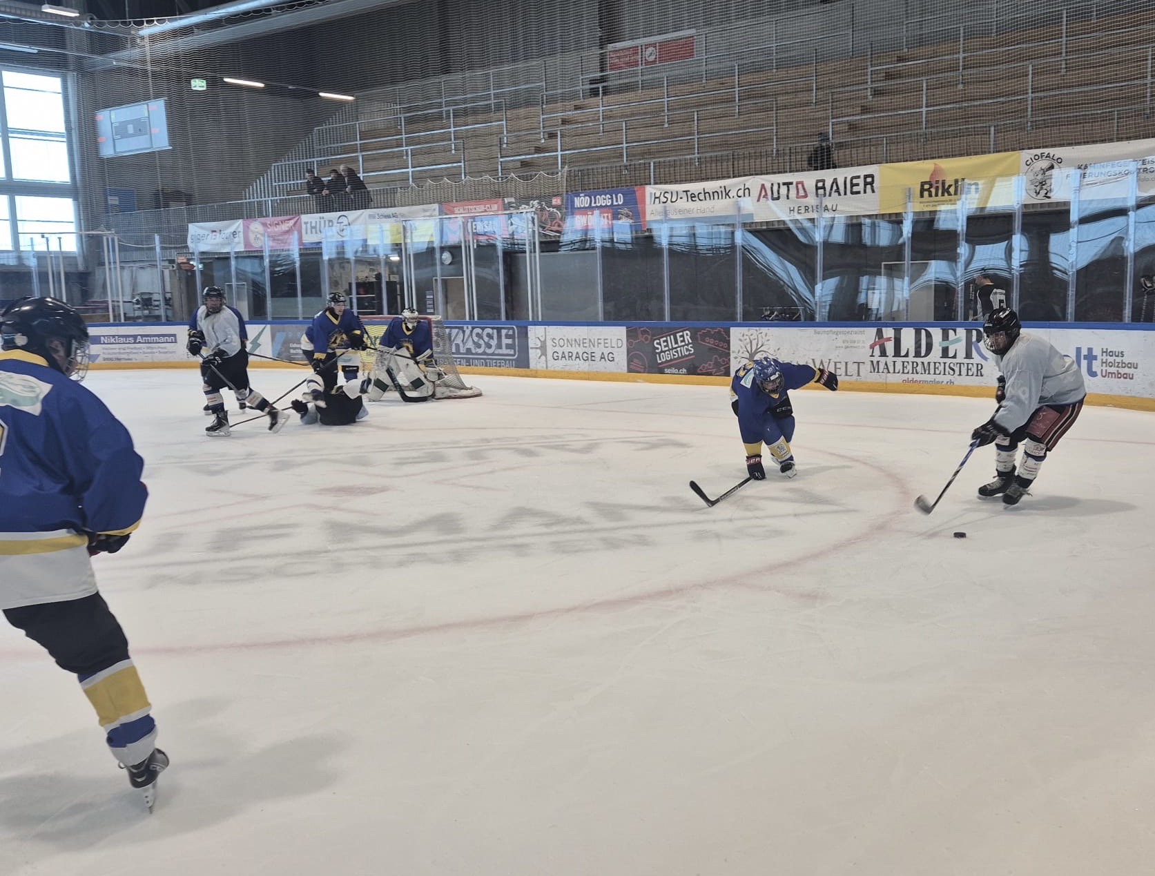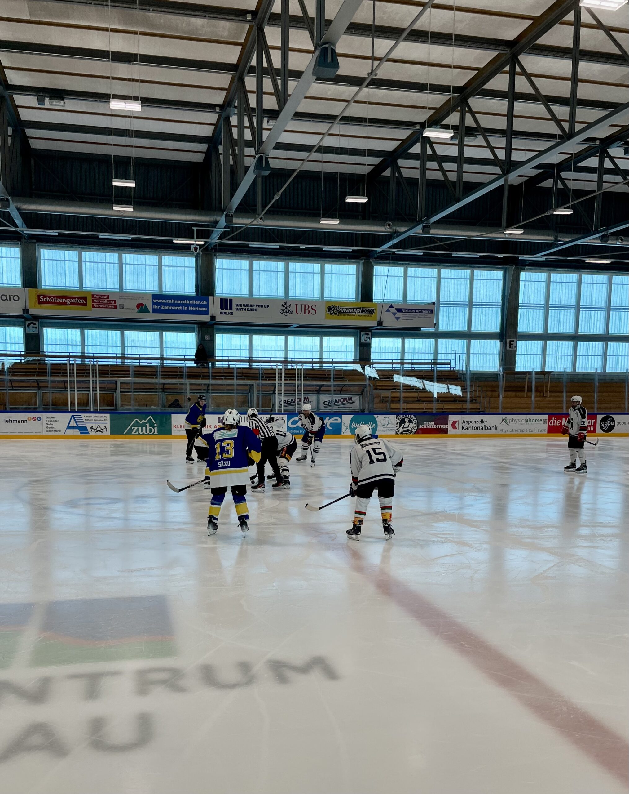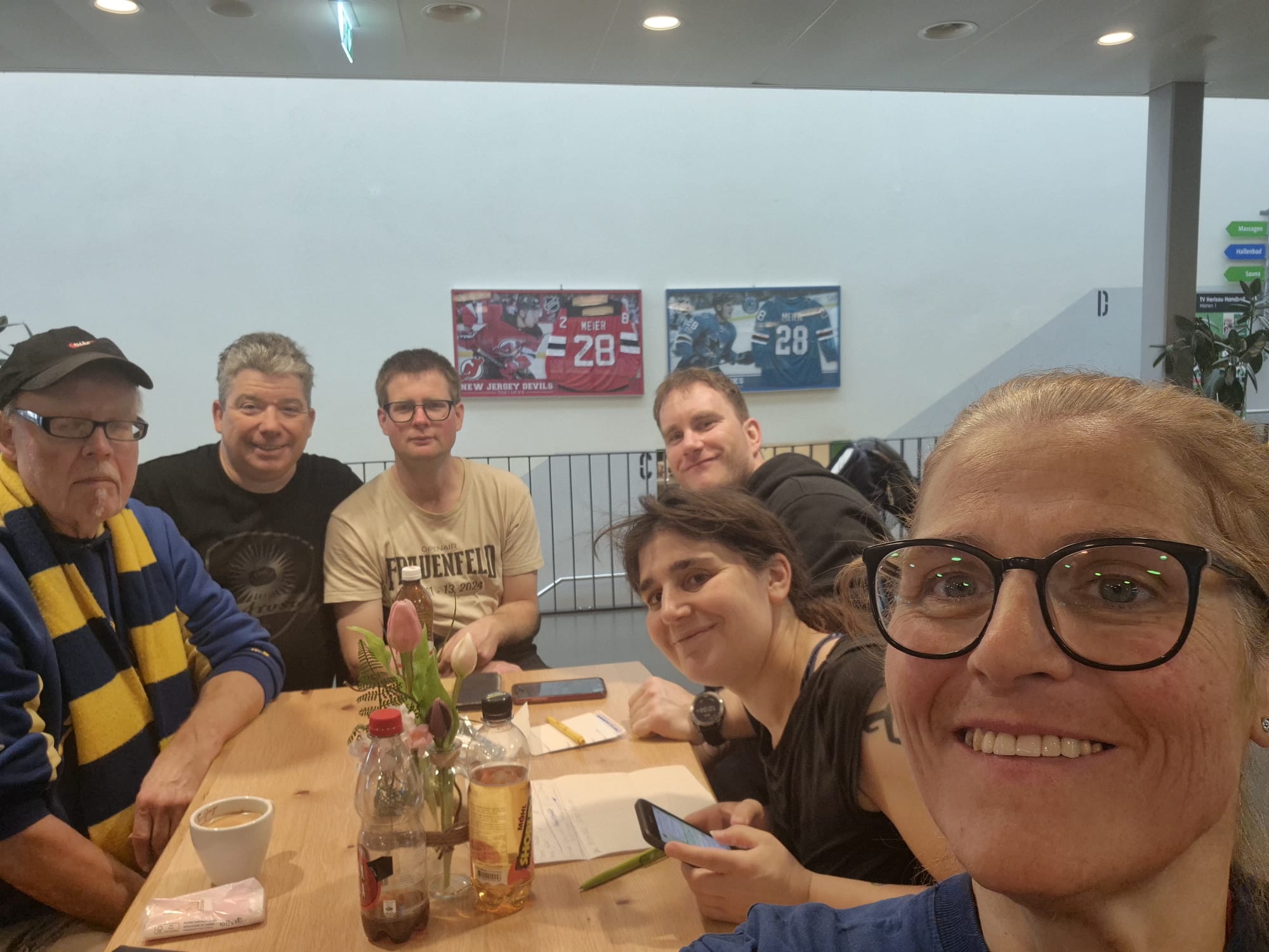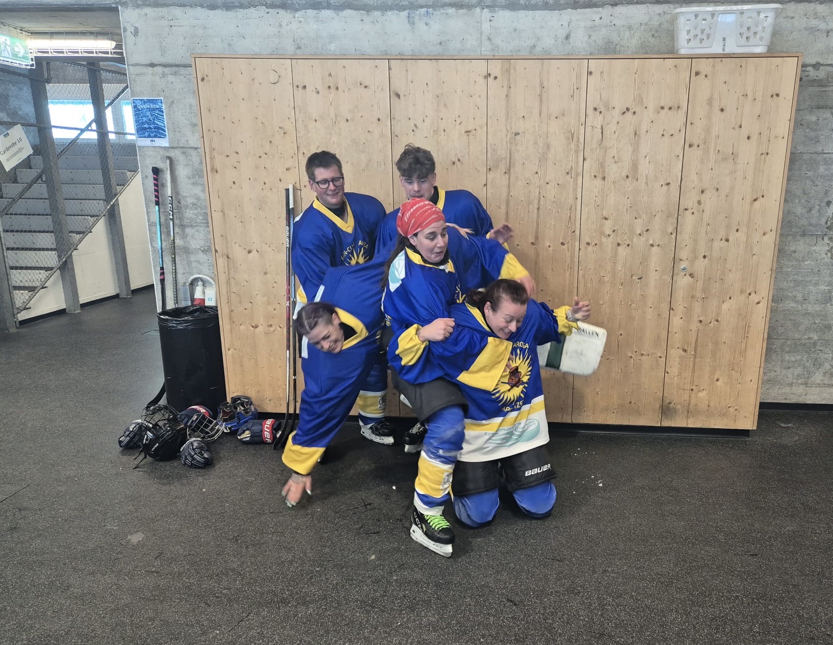 Am 28./29.März beehrt unser Hockeyteam das Plauschturnier in Herisau. Auf dem Spielplan seht ihr unsere Spiele und wenn ihr uns besuchen und anfeuern wollt seid ihr alle herzlich willkommenDa die Fanclub-SM aus undurchsichtigen Gründen abgesagt wurde schauten wir uns nach einer Alternative um und fanden das Plauschturnier in Herisau absolut passendWie man auf dem Spielplan sieht ging es bereits am Samstagmorgen los und so trafen sich die einen schon am Freitagabend und konzentrierten sich mit passender Unterstützung auf die SpielvorbereitungNoch ist die Garderobe etwas leer, doch bald gehts losAuch unser Staff Pädi1, Pädi2 und Pädi3 sind bereitDas erste Spiel gegen den SC Haarrücken oder so steht anAuch gegen die Züri Oberland Pläuschler wehrten wir uns mit allen KräftenZwar gingen beide Spiele knapp verloren, doch es machte allen grossen Spass, wiedermal auf dem Eis herum zu fahrenNun warteten noch die Ice Breakers auf uns, zu Beginn hielten wir gut mit und kassierten erst gegen Schluss die entscheidenden ToreDann gabs eine längere Pause und wie gewohnt wartete Berni’s Röteli auf unsAuch der Schnupf kam zum Zuge: Arosa, Litzirüti, Langwiiis…priiis und hopp ArosaHoppla, da wurde doch das Trikot verwechselt…aber sie macht sich gut damitAuch der Vorstand und der Ex-Presi hatten noch einige wichtige Dinge zu besprechenZum letzten Spiel warteten unsere langjährigen Freunde aus Weinfelden, die Mighty GrapesAuch hier gab unsere Abwehr allesund Goalie Käthiverhinderte manches Tor der Weinfelder, trotzdem verloren wir auch das letzte SpielUnser Goalie powerte mit Säntis EnergieNun ist das Turnier für uns vorbei, Zeit zum Ausruhen und die Geselligkeit pflegenUnsere Verteidigung ist immer noch voll im SchussHaaaalt, jetzt gibt es noch das MannschaftsphotoUnser Team, oben vl: Babs, Säntis, Berni, Mario, Tämi, Daniel, Casa, Markus, Severin, Pädi, Mama, untenvl: Denise, Frischi, Säxu, Flip, Brigitte, Tamara, Päde, vorne Goalie KäthiPuuuh, endlich ist die Eiszeit vorbei und das Vergnügen wartetIn der Herisauer Pizzeria ist alles bereit für einen ergiebigen und fein schmeckenden ZnachtBald gehts ins Bett und ein lässiger Anlass ist vorbei. Ein ganz grosses Dankeschön allen fürs Eis zerkratzen, Helfen, dumme Sprüche los werden, Getränkerunden spendieren und fötelen, bis zumnächsten Mal